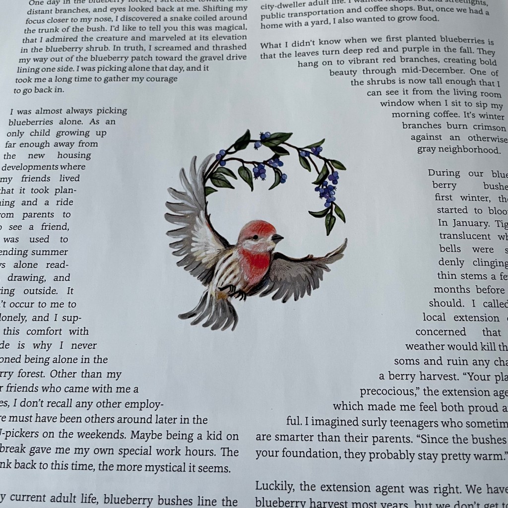Lastly, I love the way my essay is illustrated. I was deeply curious about what it would look like on the page, and Michelle Housel’s artwork could not be more perfect–the colors, the whimsy-without-being-cutesy, and the moments captured from the essay. Just look at this handsome house finch!