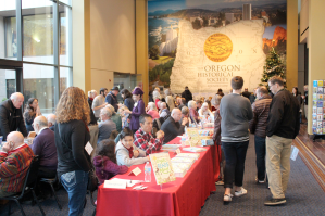 My friend, author, and publisher Laura Stanfill making everyone smile as usual–this event is how we first met!!! (Photo courtesy of OHS website.) Inviting space to meander book titles and visit with authors. (Photo courtesy of OHS website.)