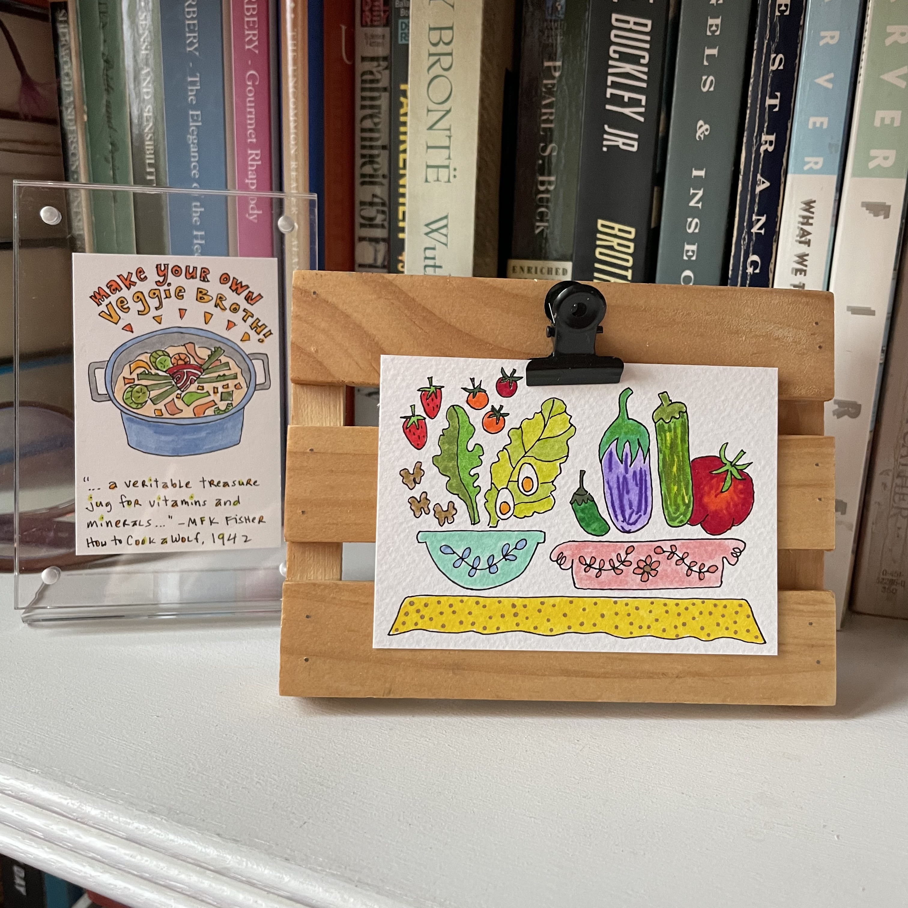 A new kitchen towel design expressing the feeling of capability and optimism I get when I make my own veggie broth. Petite produce portraits, all tiny, all original, many different designs.