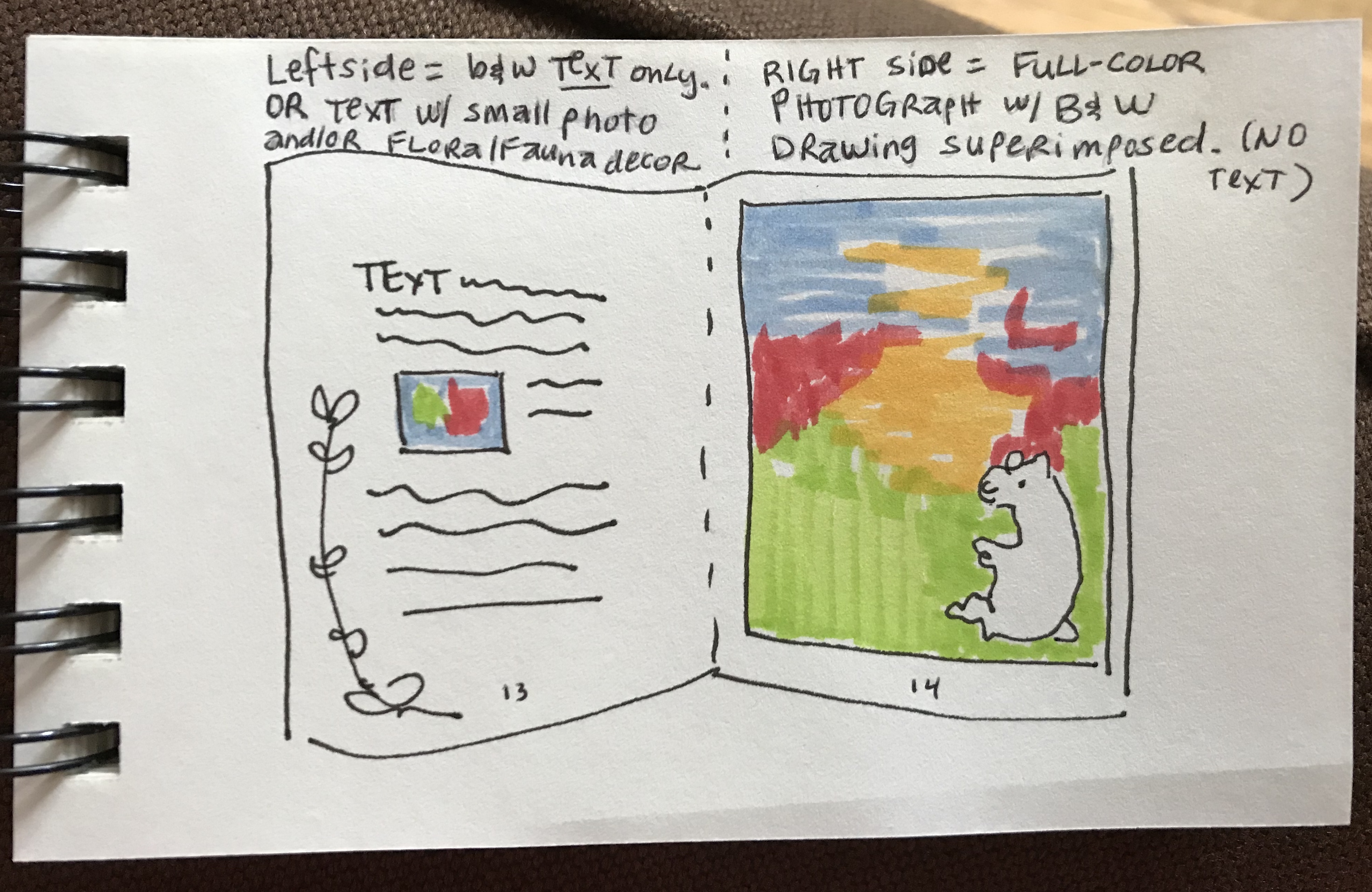 The second pivot mostly affected me. I’d had a vision of my illustrations in bold black and white against the colorful backdrop of Shelly’s photographs. I really loved this idea, thought it made our book unique, and I even managed to create an example after taking a tedious and difficult online Photoshop class.