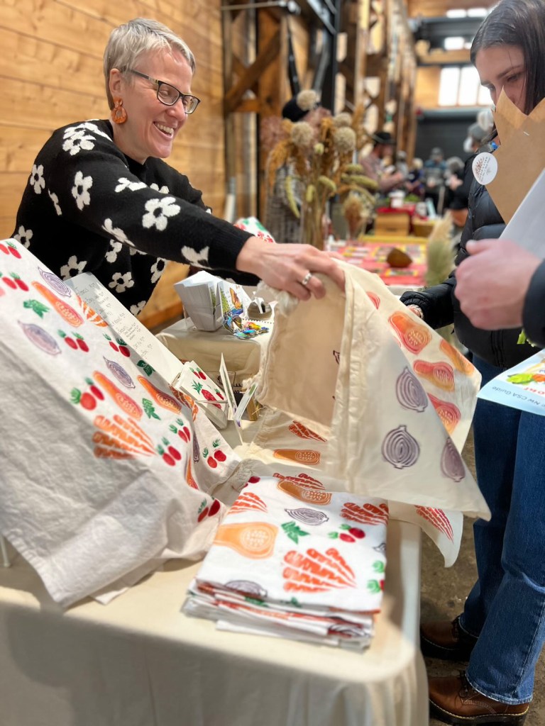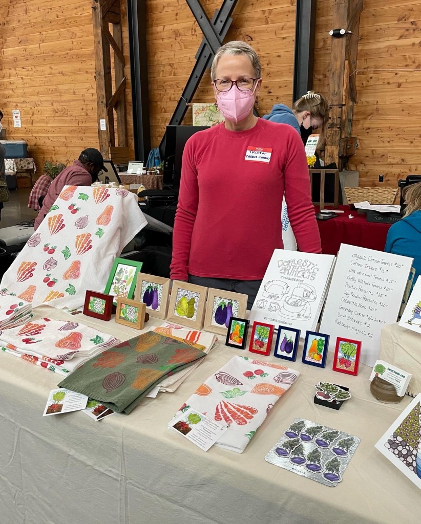 I also had a great time at the Share Fair in February, selling my produce-themed artwork and connecting with farmers, seed cultivators, mushroom growers, a family-run salmon company, bakers, and deli owners. The day flew by for me. I sold out of hand-printed towels and all but two produce portraits, and came home with a notebook of ideas and new friends.