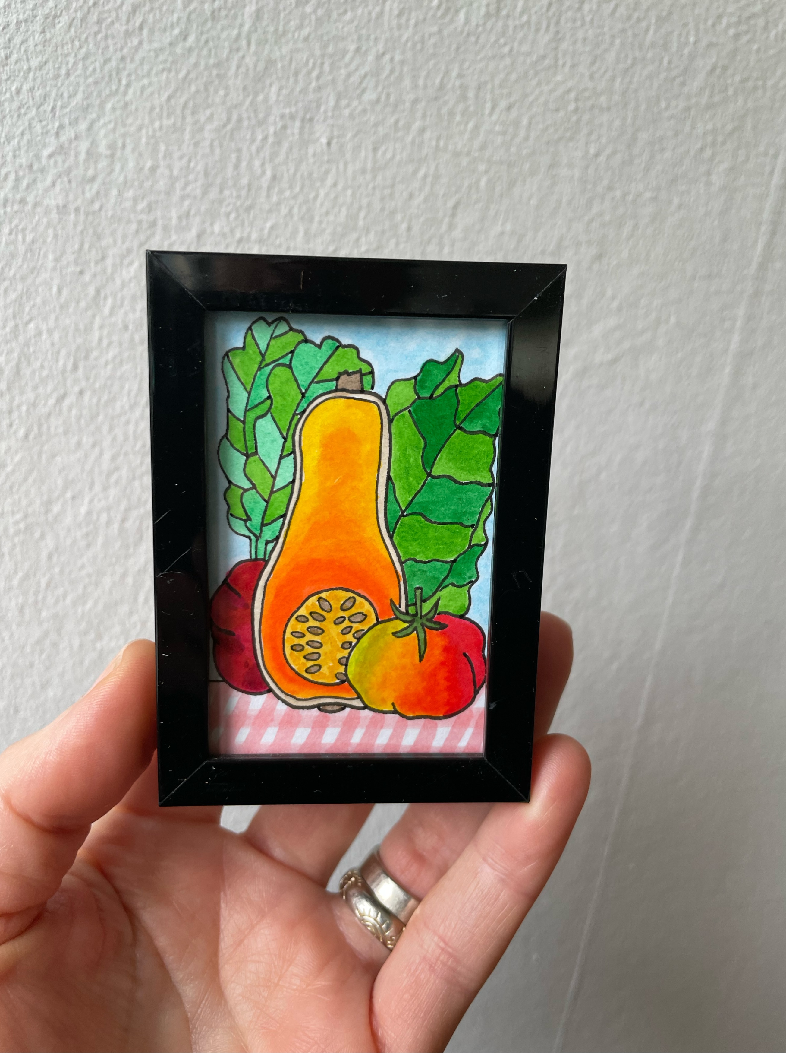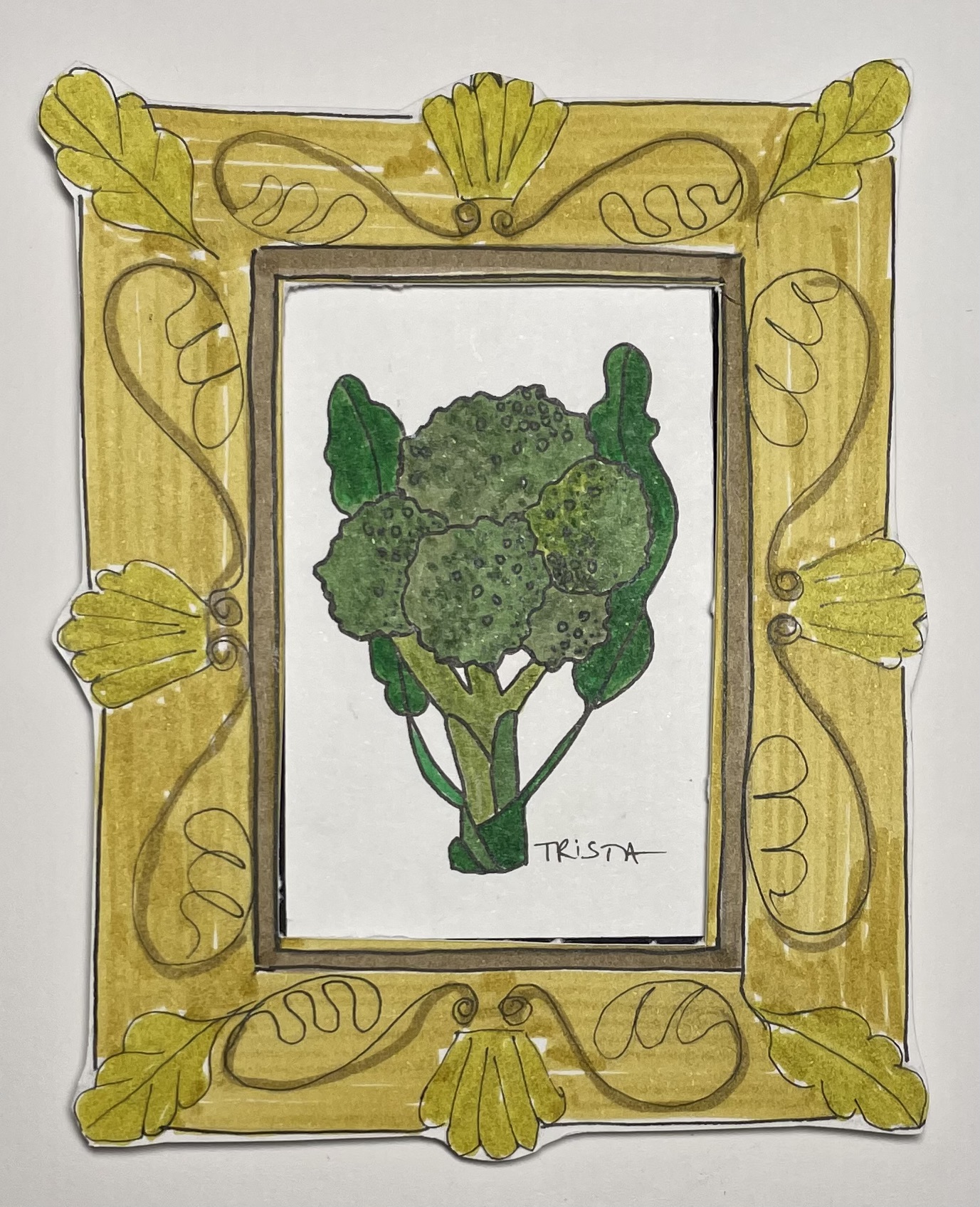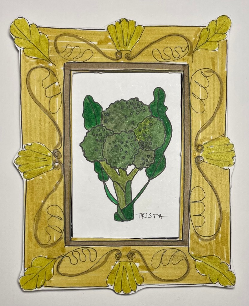 I want to draw ornate gold frames around my produce portraits. To me, this is both funny and reverential. An ode to the power of vegetables, but also funny because I plan to wrap broccoli and kale in gilded frames traditionally reserved for portraits of wealthy landowners, influential leaders, kings, and titans of industry. All Hail King Broccoli!