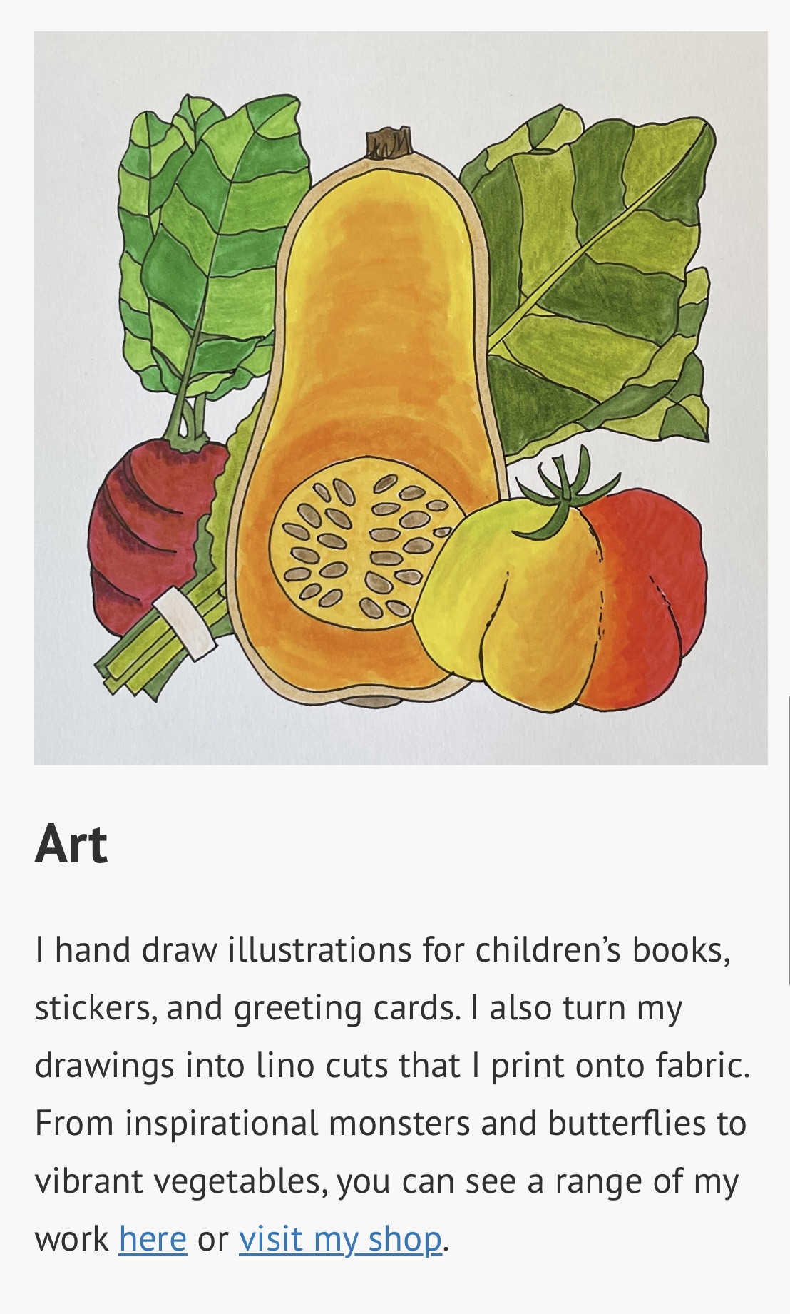 I’ll have hand-printed kitchen towels for sale as well as hand-drawn produce portraits, and a few other things from my Carrot Condo shop.