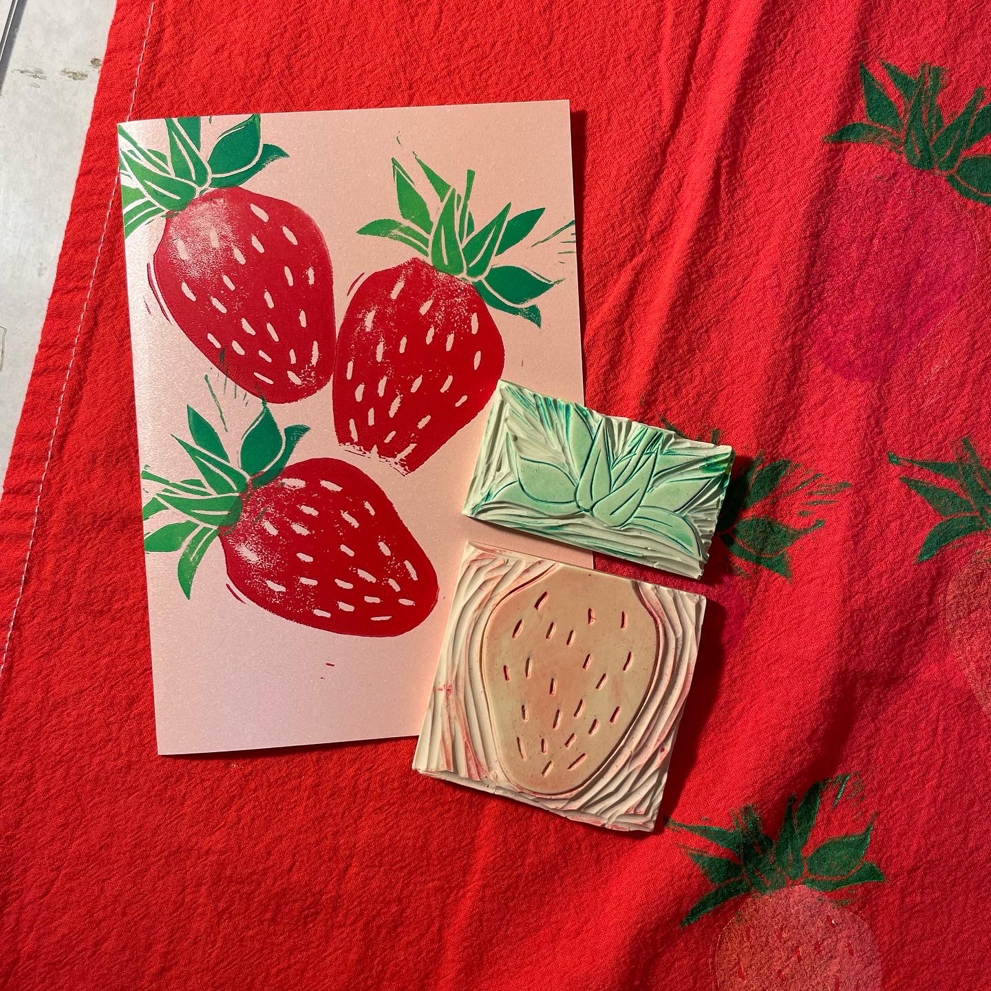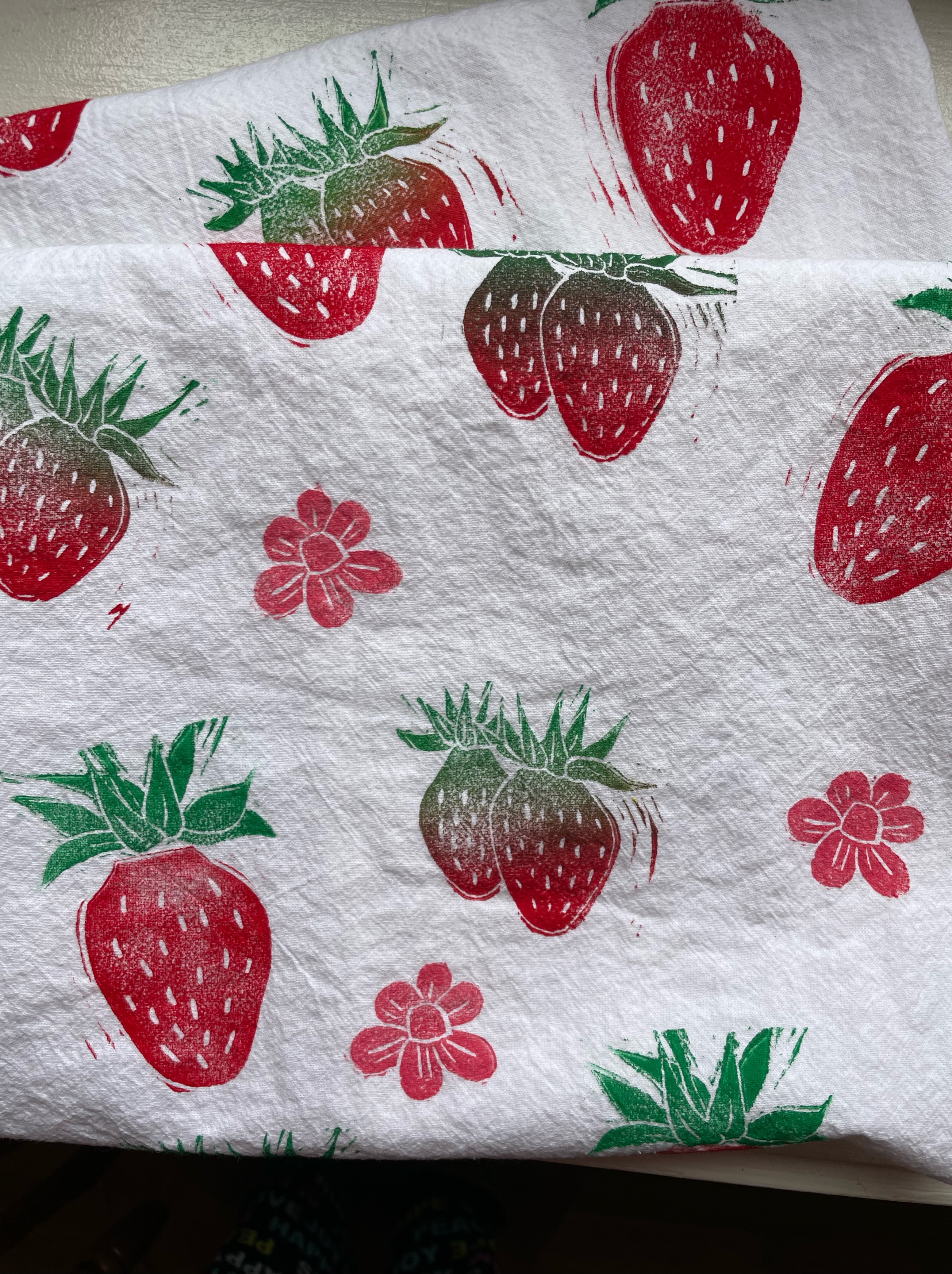 I’ll have strawberry towels and also a few strawberry cards with matching envelopes, all hand-printed.