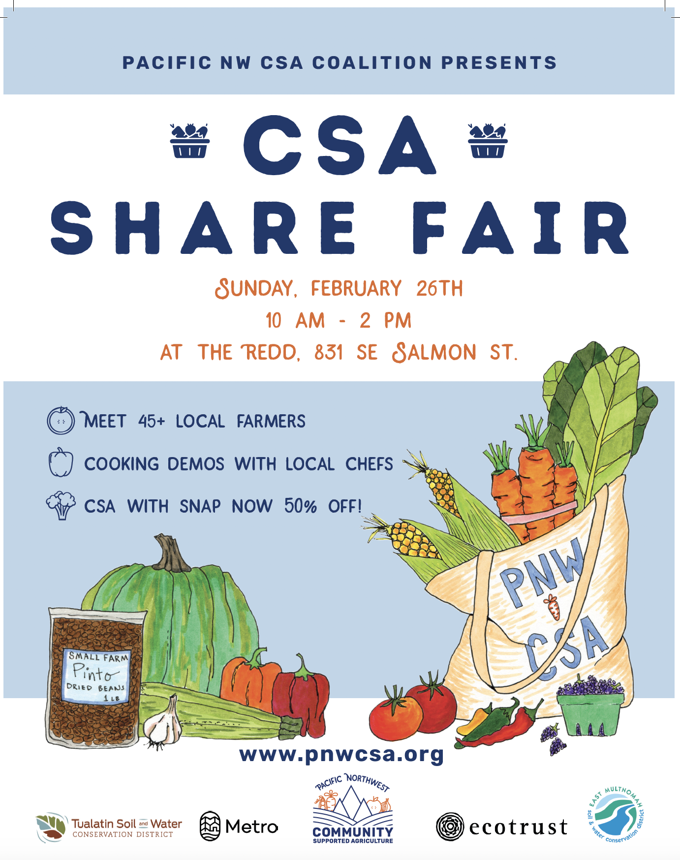 The best place for more information is Pacific Northwest CSA’s instagram account: @PNWCSA . Their website is http://www.pnwcsa.org/csasharefair . Or just ask me!