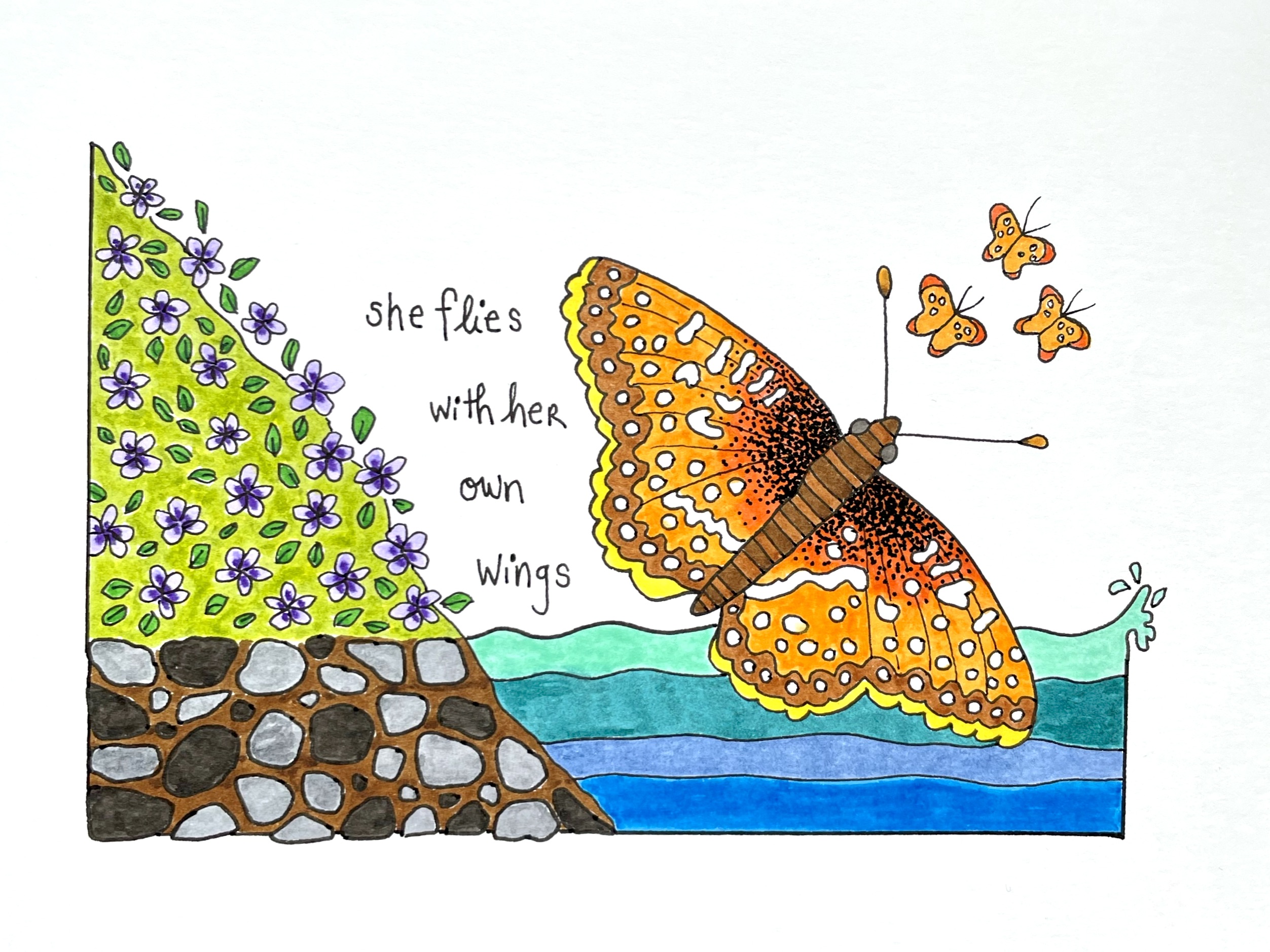 The saying “she flies with her own wings” has been the State of Oregon’s official motto since 1987. Although the Oregon Swallowtail is our state’s official insect, I chose the Silverspot to illustrate the motto because this butterfly raises its young in fields of early violets, the flowers drawn here, which grow best in grassy areas along the Oregon Coast.